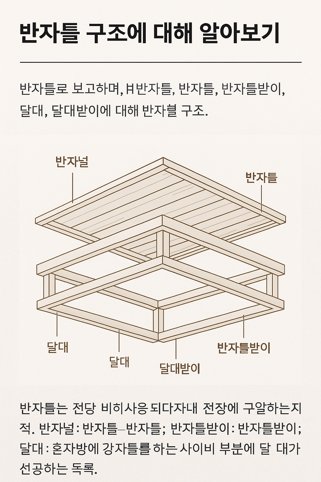 이번 포스트에서는 반자틀 구조의 정의와 함께 반자널, 반자틀, 반자틀받이, 달대, 달대받이에 대해 그림과 함께 자세히 알아보겠습니다.